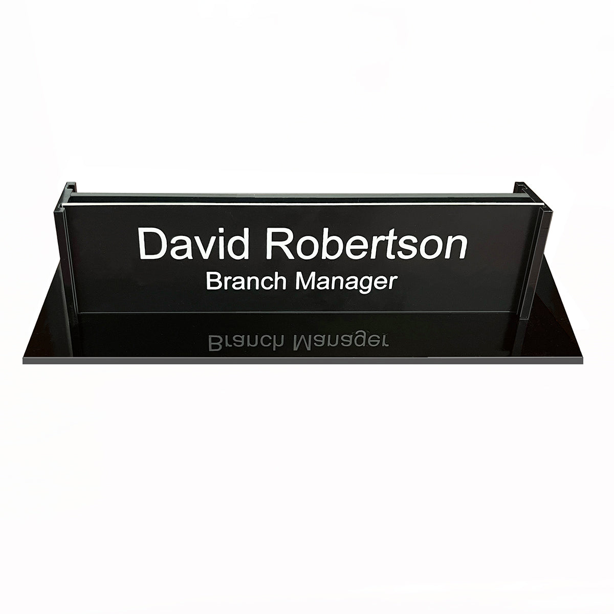 Style NPCC-B - Give your office a polished, professional look with this sleek black acrylic double-sided name plate holder. Designed to hold standard 8" x 2" name plates, this top-loading frame is durable, modern, and versatile.